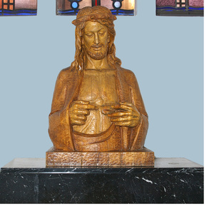 Die Herz-Jesu-Skulptur wurde im Jahr 1946/47 aus Lindenholz geschnitzt und mit einer leichten Tönung an die anderen Figuren angepasst. Sie steht auf einem schwarzen Marmorblock.