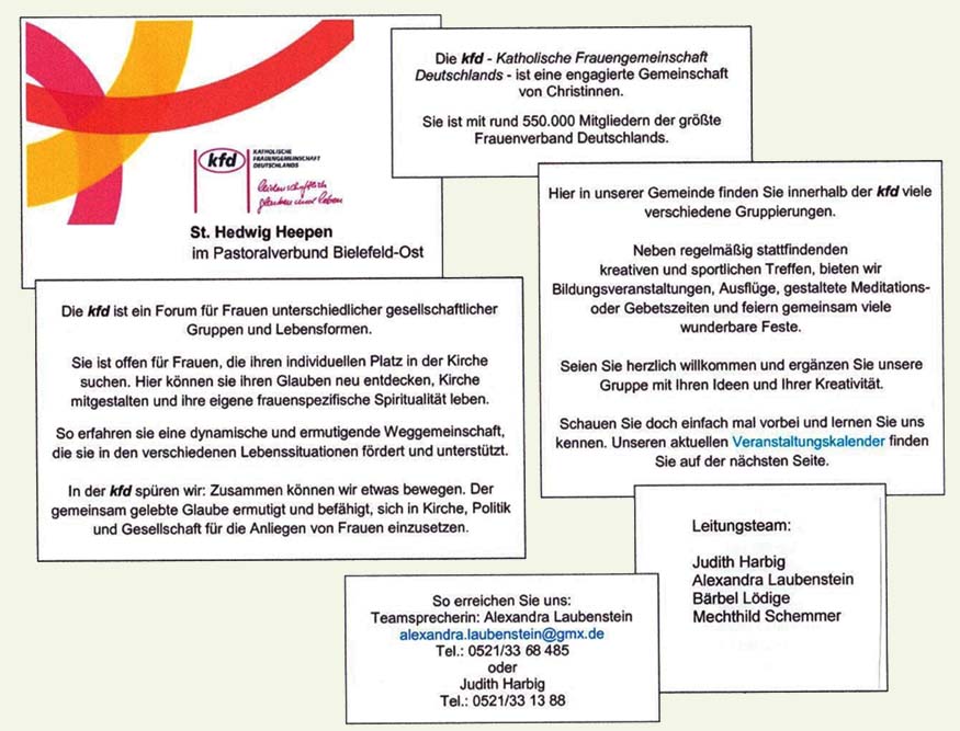 Das Leitungsteam trifft sich in der Regel am 1. Dienstag im Monat um 18:30 Uhr im Bischof-Meinwerk-Haus. Wir freuen uns auf Ideengeberinnen und Interessierte, die mitmachen wollen.